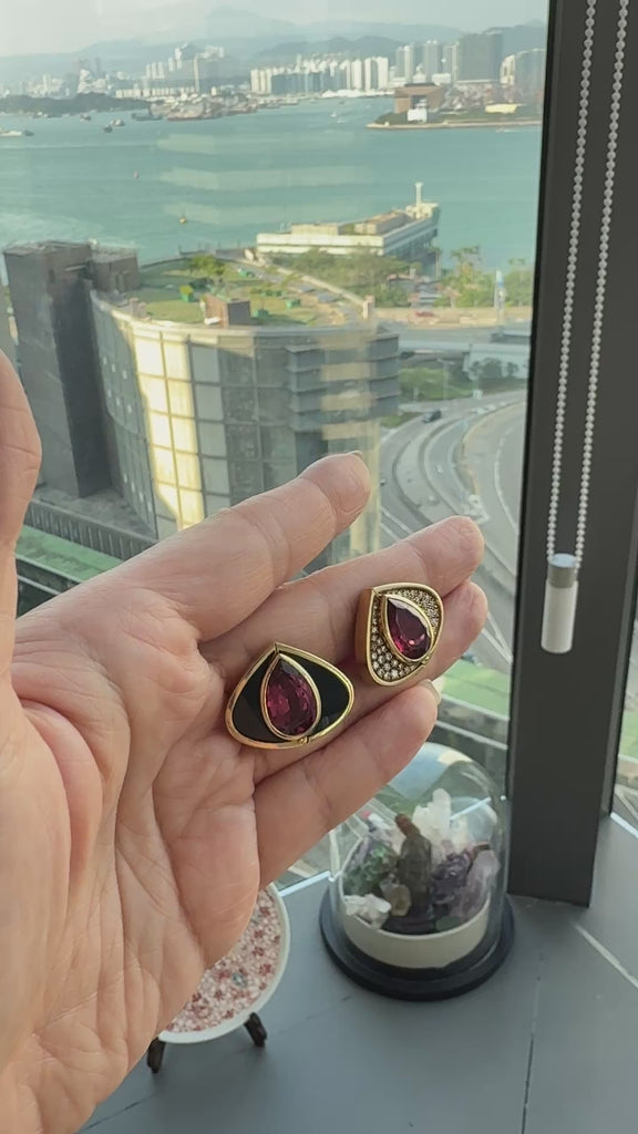 18k yellow gold earrings· Set with diamonds, black onyx, and tourmaline· Convertible design with interchangeable onyx and diamond components